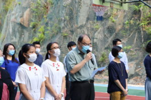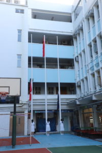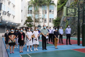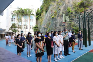 2020年6月30日,我校舉行升旗儀式,以慶祝香港特別行政區成立23周年。儀式中,中史科主任程裕昌老師分享升旗的冷知識及需要注意既事項︰升旗時間是以每天太陽從中國東海海平線升起既個刻為準,以象徵祖國如旭日東昇、前程無量;升旗速度則用電子儀器控制,在演奏國歌的第一個音符起開始升旗,全曲演奏3遍,國旗會準時到達28.3米高既旗桿頂端,每個細節都十分講究。程老師要求升旗禮進行期間,當司儀宣佈儀式開始,所有與會師生務必嚴肅認真;肅立站好;雙手垂放在身體兩旁;面向旗桿、眼睛注視着國旗,即所謂行注目禮;待升旗隊出旗、掛上國旗及區旗,司儀宣佈唱國歌,所有與會者一起高唱國歌。