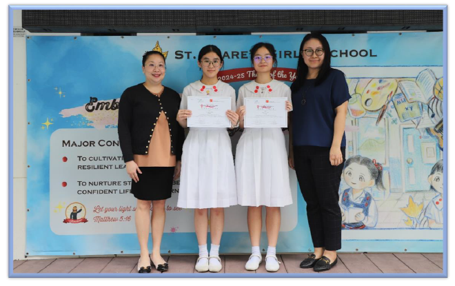 In the Hong Kong Young Ambassador Scheme 2023-2024, co-organized by the Tourism Commission of the Hong Kong Special Administrative Region Government and the Hong Kong Federation of Youth Groups, S6 Simone Cheung was awarded the Silver Medal for contributing over 100 hours of voluntary service. Also, S6 Vianne Fong was awarded the Gold Medal for contributing over 200 hours of service.