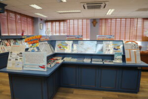 - A library book display featuring a paper plane folding activity.